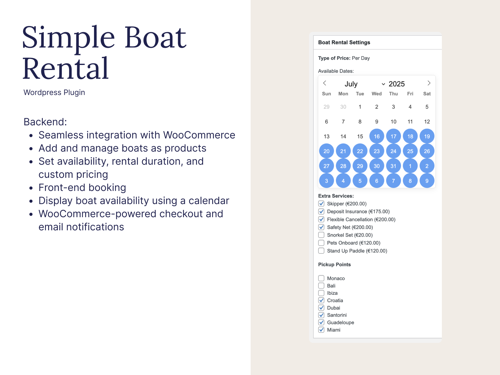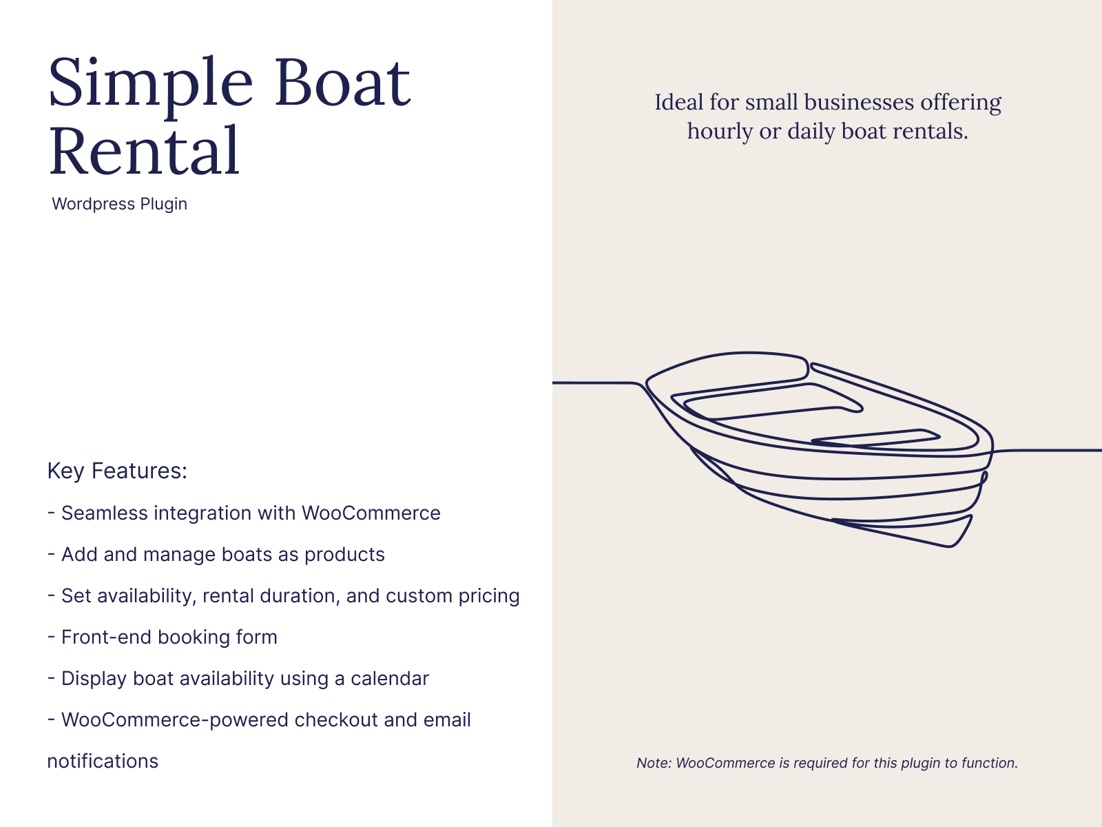 Simple Boat Rental is a WooCommerce-based plugin that allows you to manage and sell boat rental bookings directly from your store.
